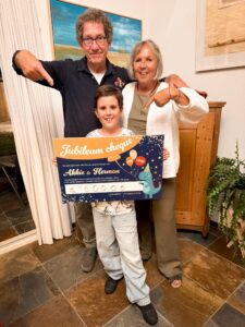 In augustus vierden de tante en nonkel van mijn mama hun 50e huwelijksverjaardag. Zij gaven een groot feest, en vroegen de gasten om geen cadeaus mee te brengen, maar in de plaats daarvan centjes te doneren voor vzw Kinderkankerfonds. Zo konden zij dit mooie bedrag inzamelen. Ze zorgden bovendien voor een mooie zelfgemaakte cheque om te overhandigen.
